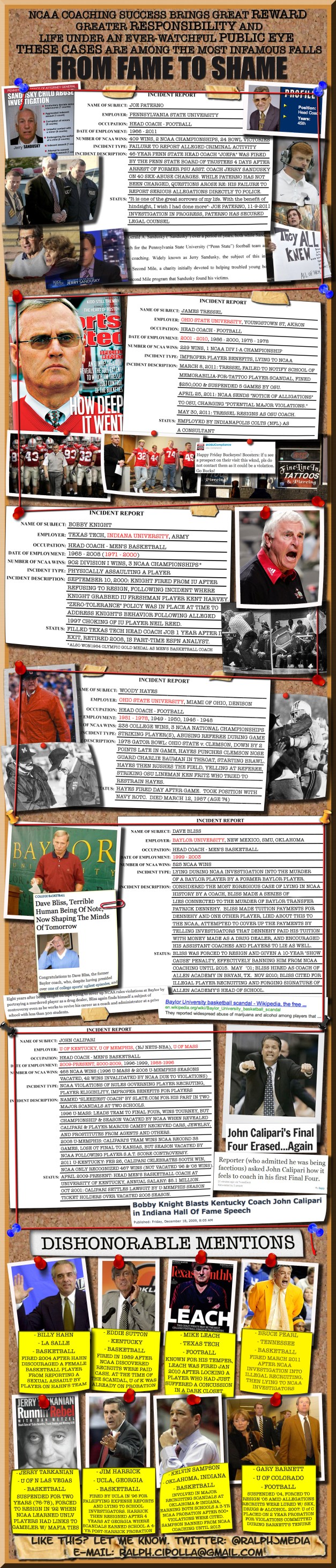 (Note: Obviously inspired by the Penn State Sandusky-shop-of-horrors, I didn’t include the on-going & growing Syracuse University abuse scandal. Look for that in my next, nearly complete project – The Periodic Table of NCAA Scandals.)